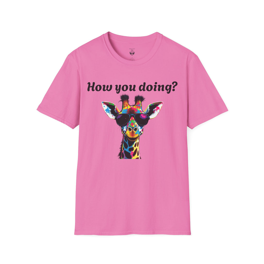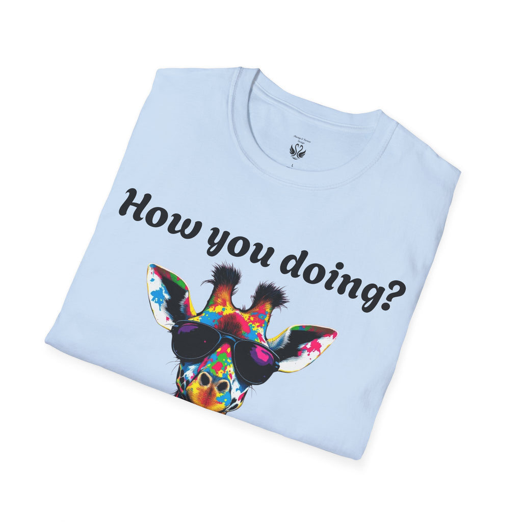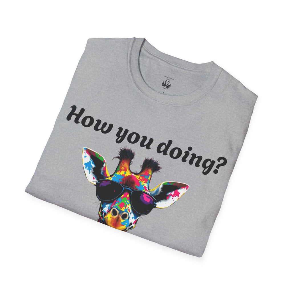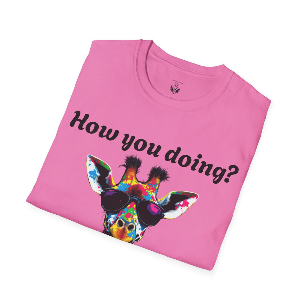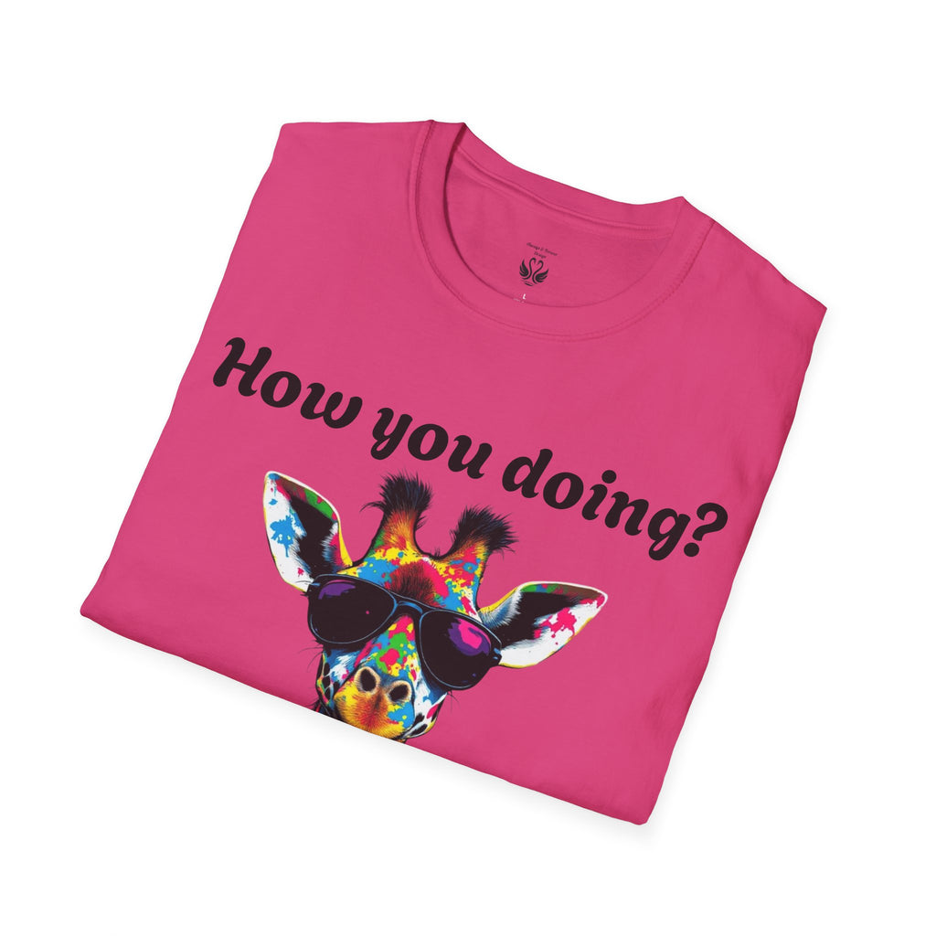 Introducing our vibrant Unisex Softstyle T-Shirt, designed to bring a splash of color and positivity into your wardrobe! This eye-catching tee features a whimsical giraffe graphic paired with the playful phrase, "How you doing?" Perfect for sparking smiles and conversations, this shirt adds a fun touch to everyday outfits. It’s ideal for both casual outings and relaxed gatherings, making it a versatile piece for anyone who loves to express their unique style. This t-shirt is a fantastic gift for animal lovers, friends, or family members looking to embrace their individuality during birthdays, holidays, or just because. Whether lounging at home or heading out with friends, you’ll feel comfortable and confident in this soft and stylish tee.