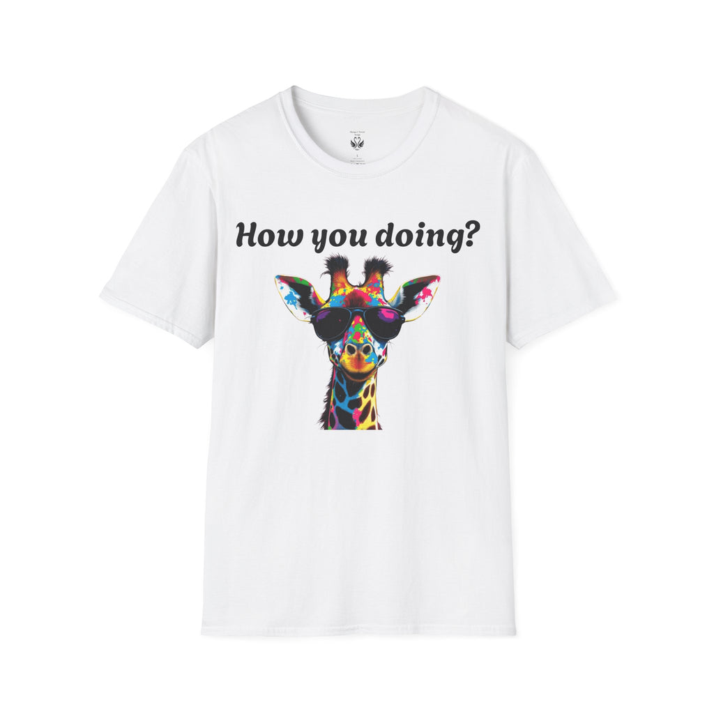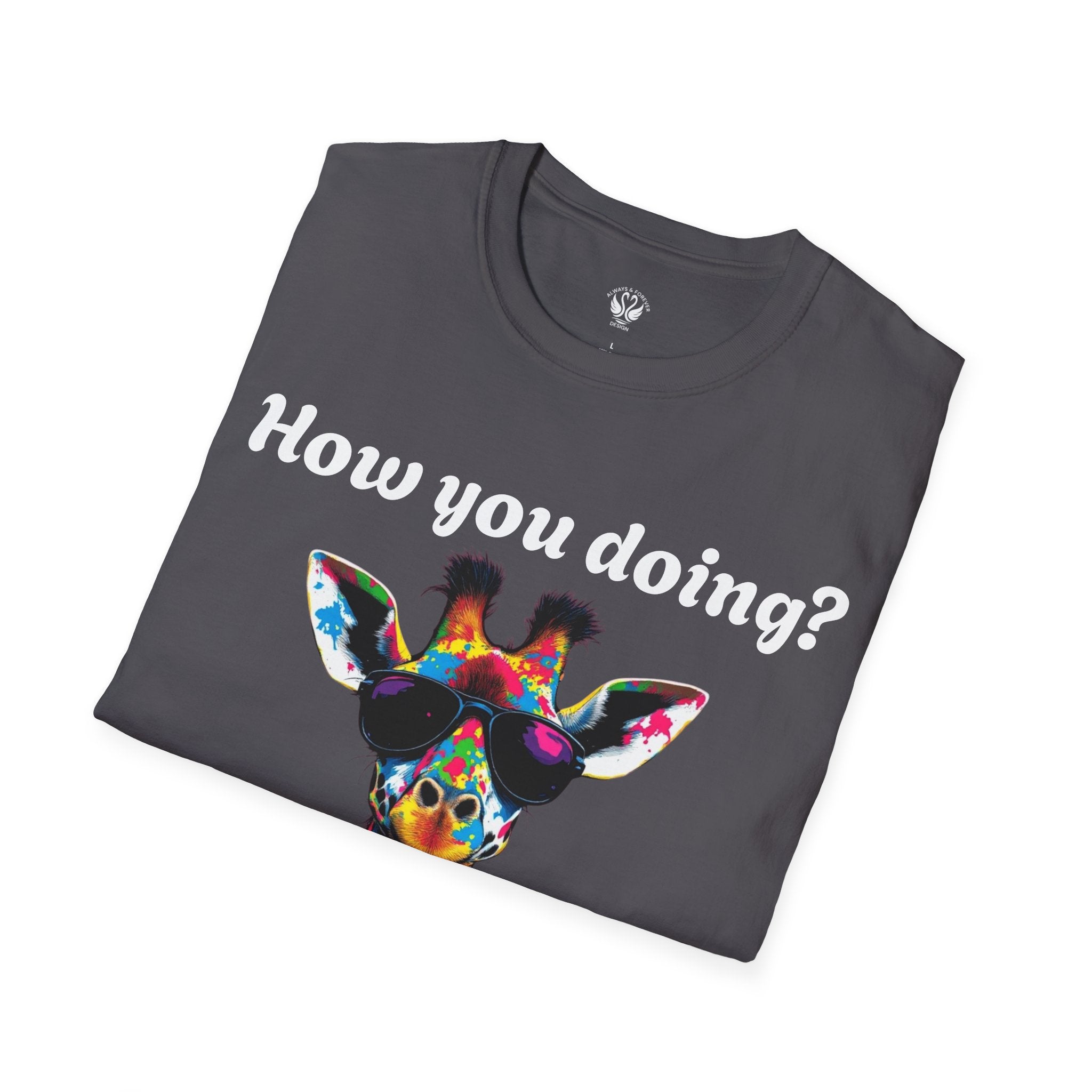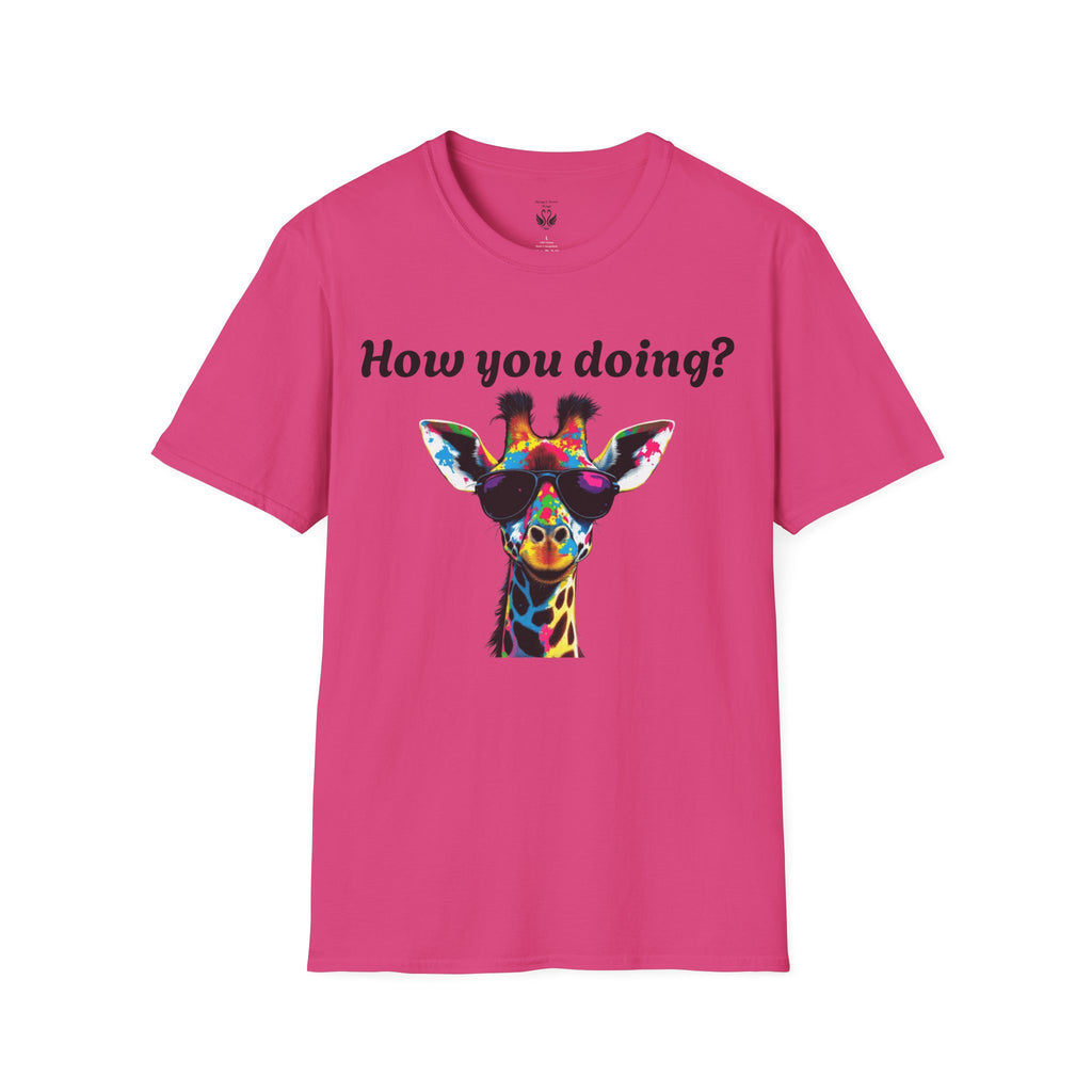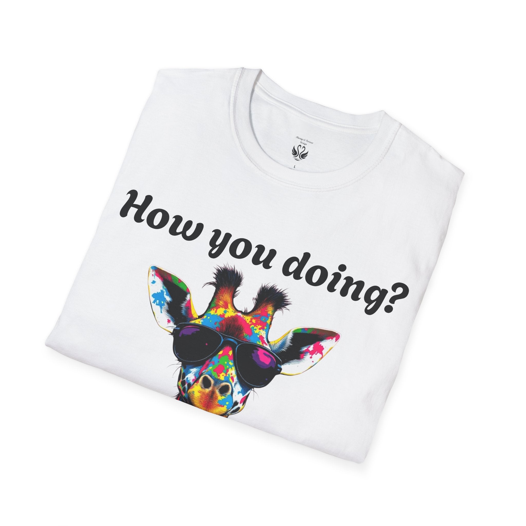 Introducing our vibrant Unisex Softstyle T-Shirt, designed to bring a splash of color and positivity into your wardrobe! This eye-catching tee features a whimsical giraffe graphic paired with the playful phrase, "How you doing?" Perfect for sparking smiles and conversations, this shirt adds a fun touch to everyday outfits. It’s ideal for both casual outings and relaxed gatherings, making it a versatile piece for anyone who loves to express their unique style. This t-shirt is a fantastic gift for animal lovers, friends, or family members looking to embrace their individuality during birthdays, holidays, or just because. Whether lounging at home or heading out with friends, you’ll feel comfortable and confident in this soft and stylish tee.