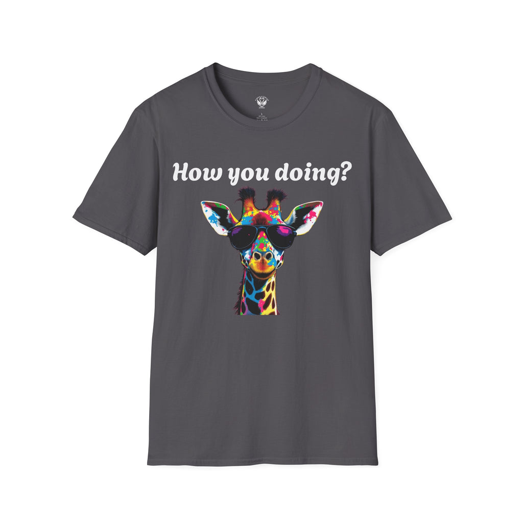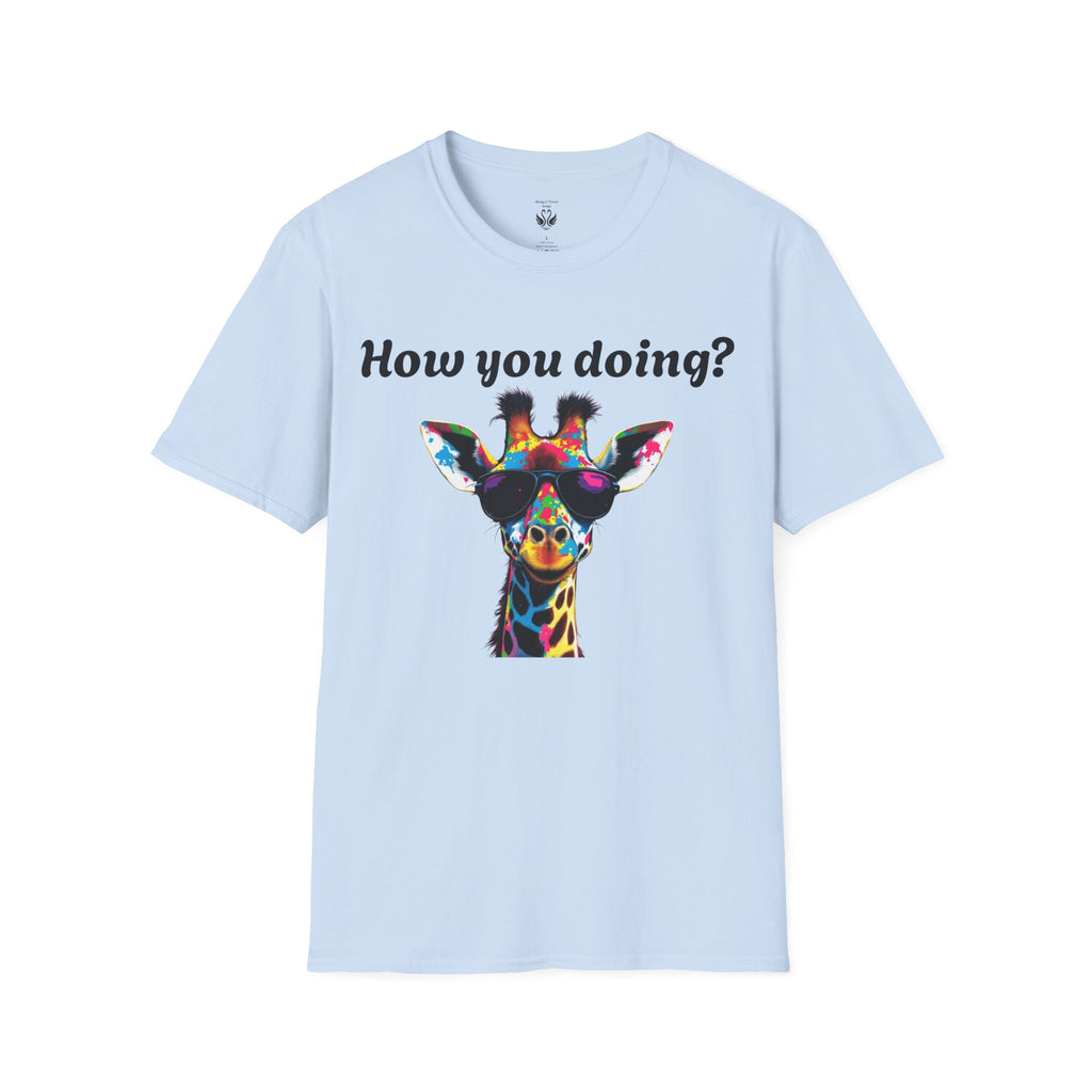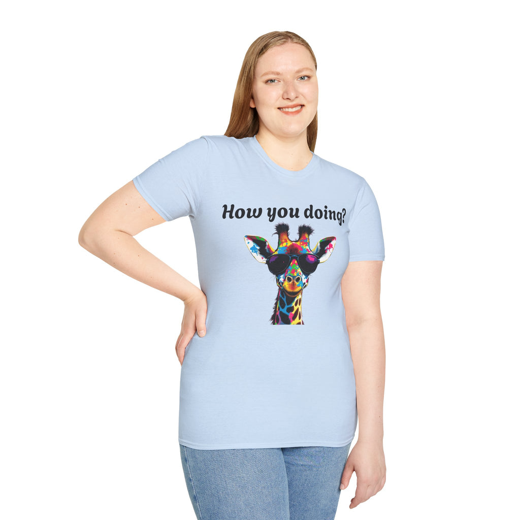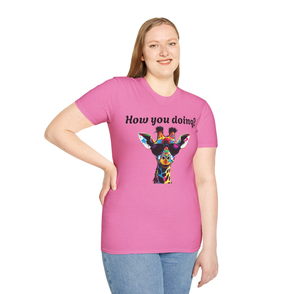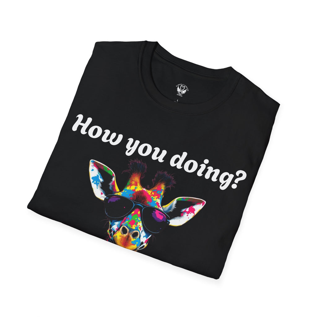Introducing our vibrant Unisex Softstyle T-Shirt, designed to bring a splash of color and positivity into your wardrobe! This eye-catching tee features a whimsical giraffe graphic paired with the playful phrase, "How you doing?" Perfect for sparking smiles and conversations, this shirt adds a fun touch to everyday outfits. It’s ideal for both casual outings and relaxed gatherings, making it a versatile piece for anyone who loves to express their unique style. This t-shirt is a fantastic gift for animal lovers, friends, or family members looking to embrace their individuality during birthdays, holidays, or just because. Whether lounging at home or heading out with friends, you’ll feel comfortable and confident in this soft and stylish tee.