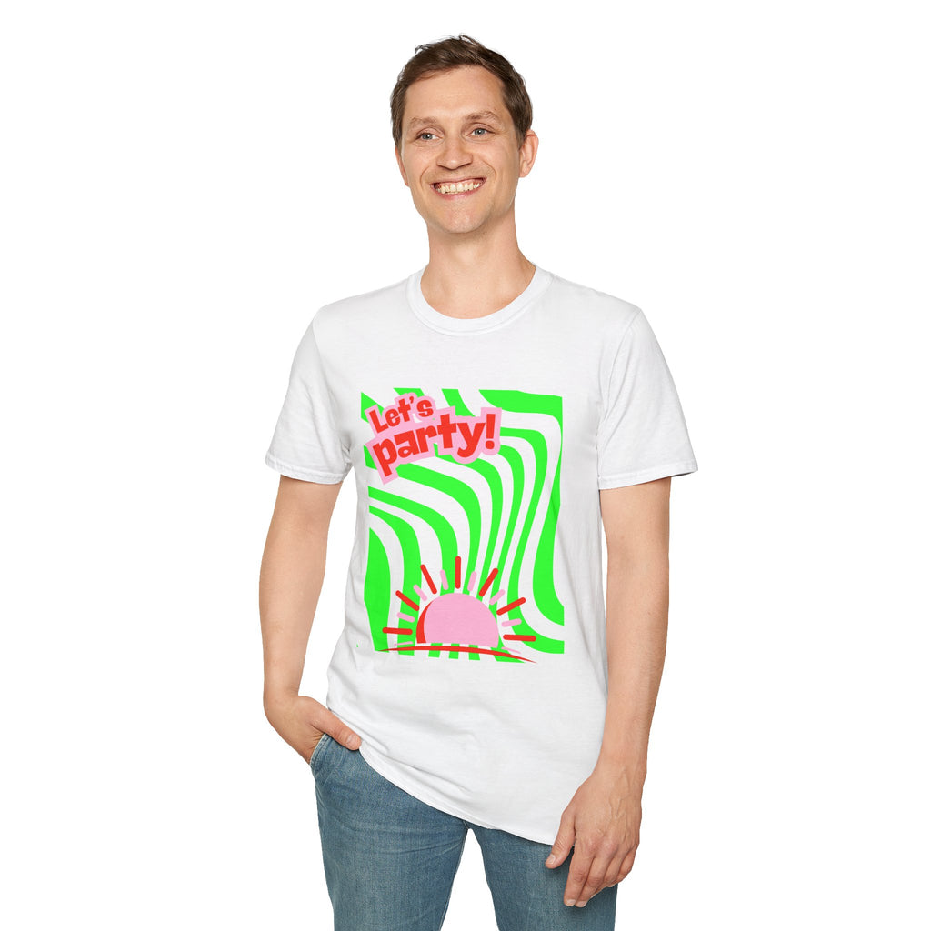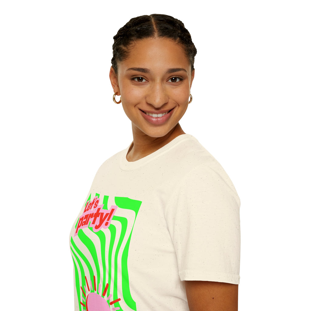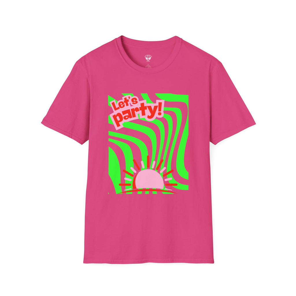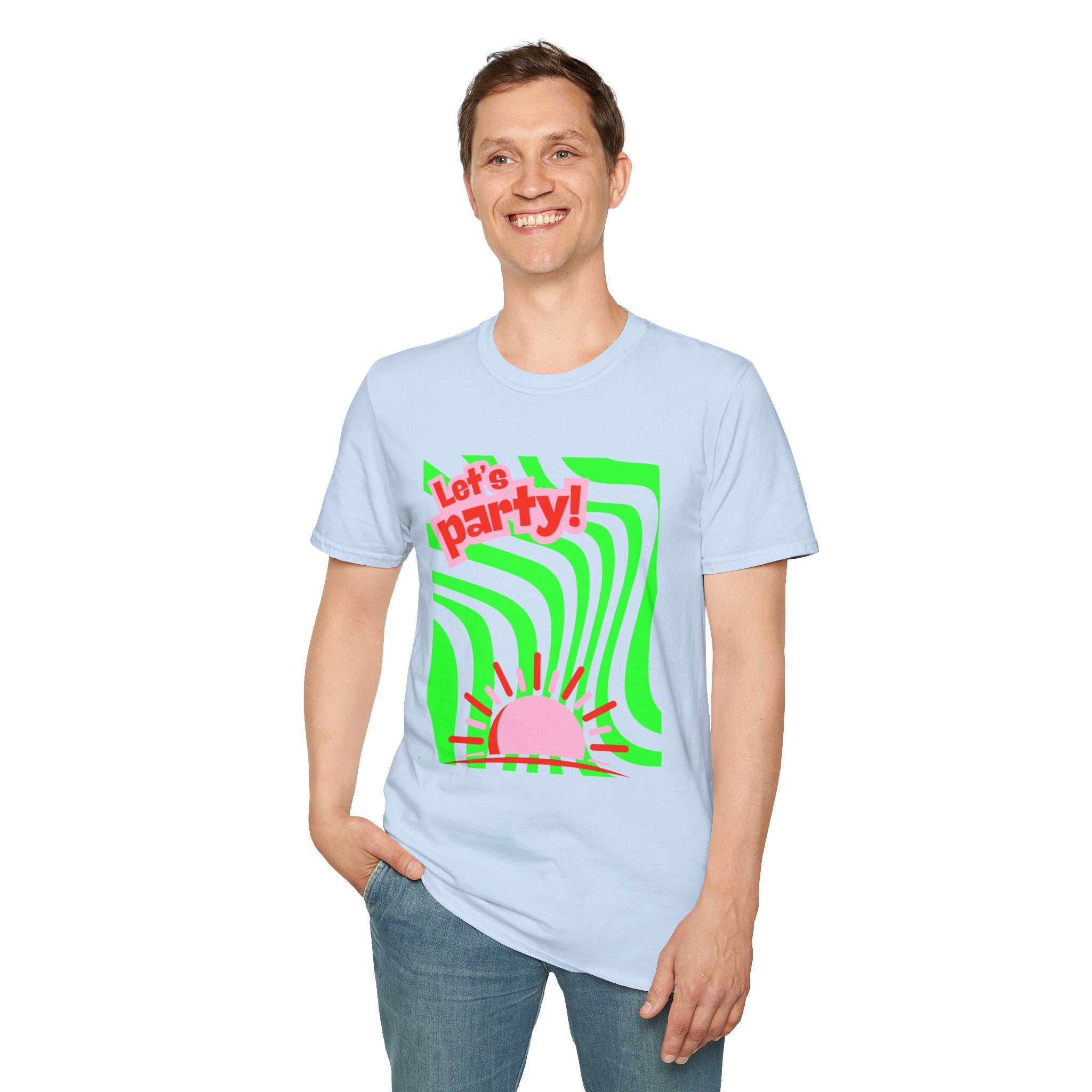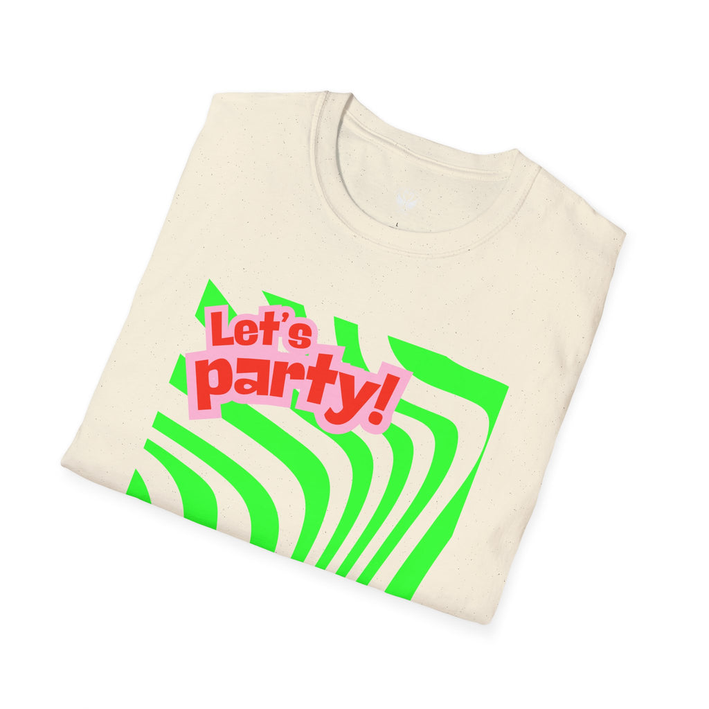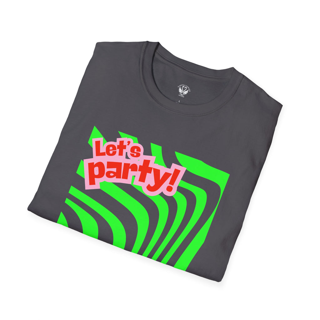 Introducing our vibrant Unisex Softstyle T-Shirt, the perfect addition to any casual wardrobe. This t-shirt exudes a fun, lively vibe, making it ideal for parties or gatherings with friends. Made from 100% ring-spun cotton, it provides exceptional comfort suitable for all-day wear during summer festivals, birthday celebrations, or lazy weekends at home. Its bold, playful design featuring a ‘Let’s party!’ theme brings a spark of joy and is relevant for those who love to celebrate life’s moments. Perfect for young adults and anyone who enjoys a casual yet stylish look, this t-shirt is bound to elevate your outfit and spread good vibes.