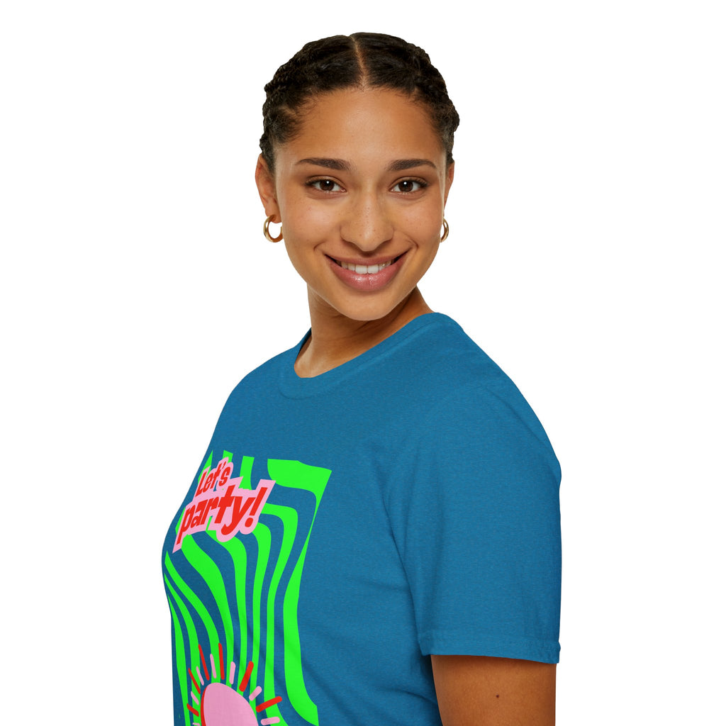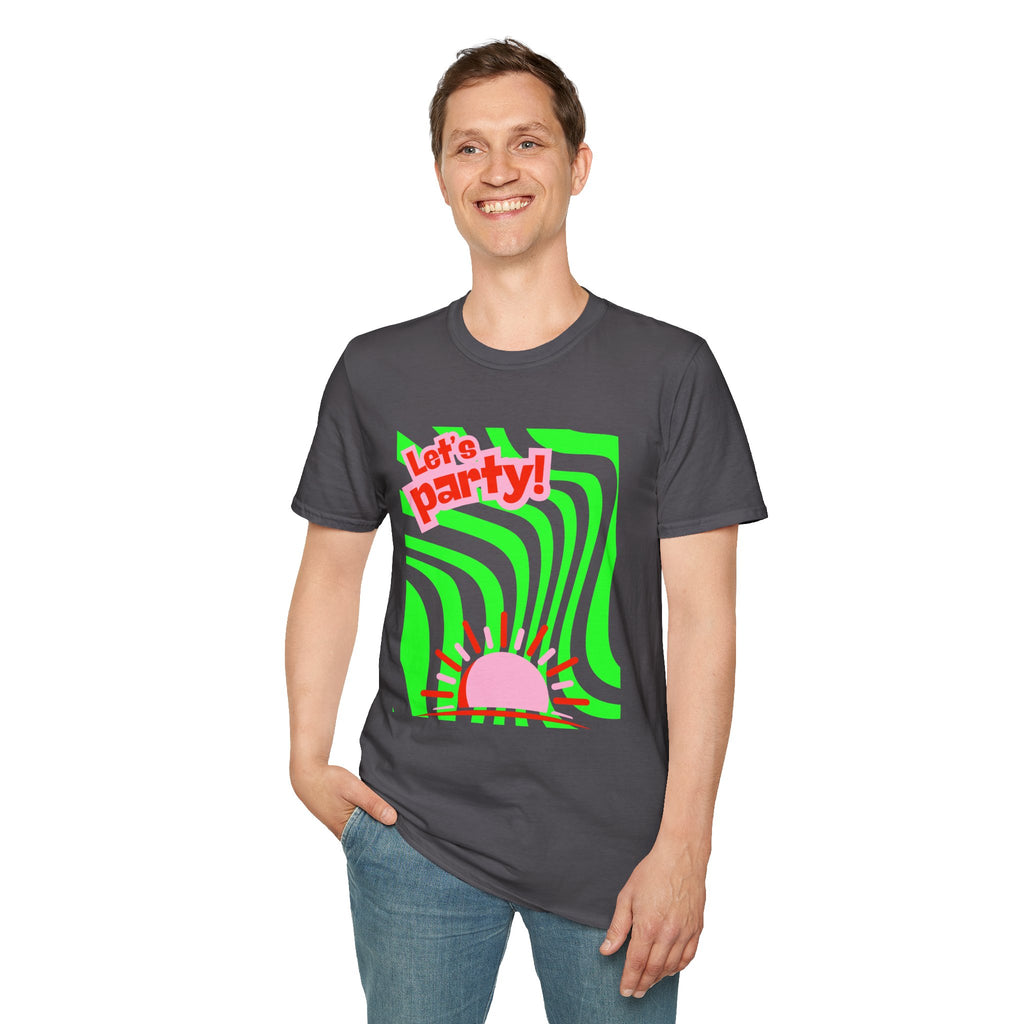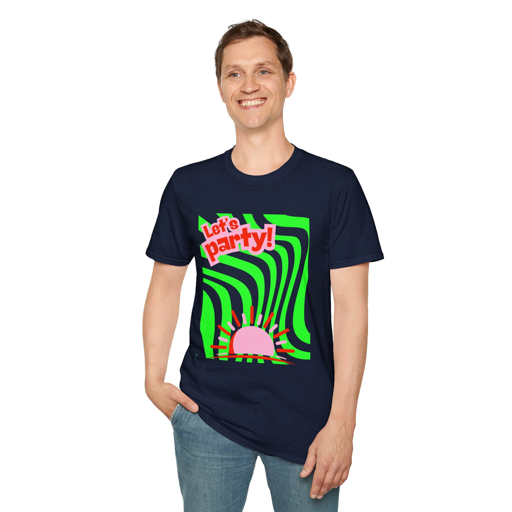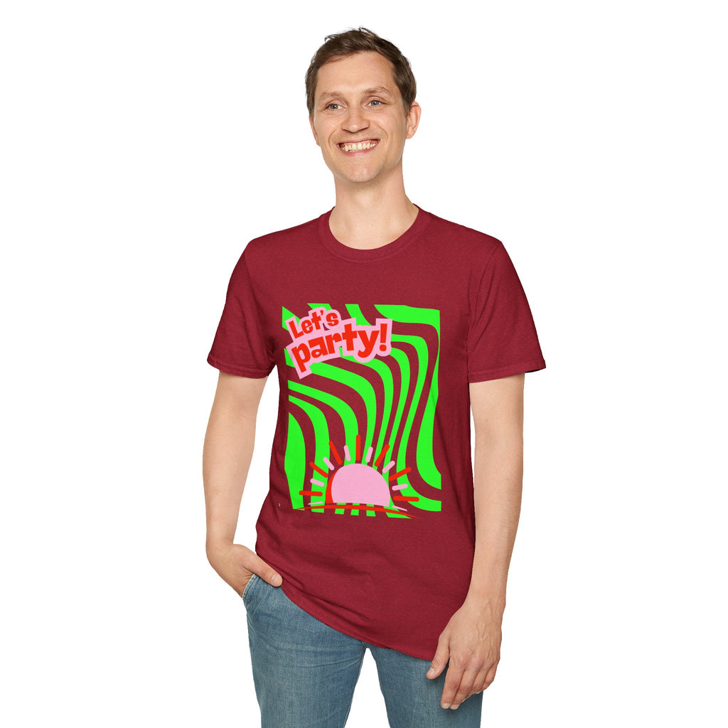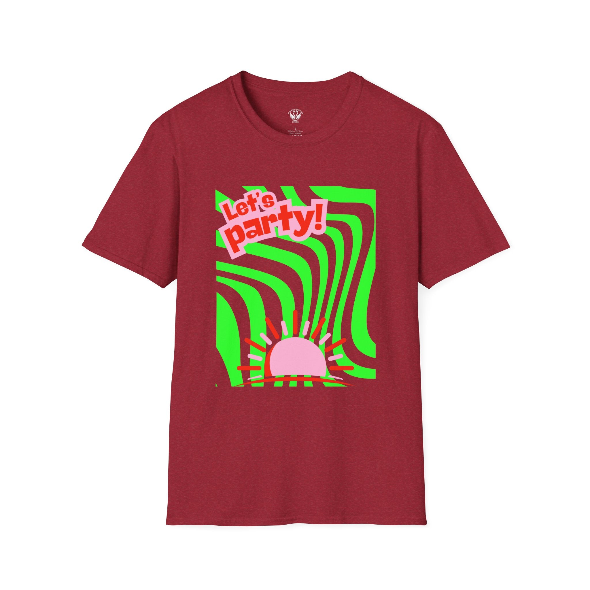 Introducing our vibrant Unisex Softstyle T-Shirt, the perfect addition to any casual wardrobe. This t-shirt exudes a fun, lively vibe, making it ideal for parties or gatherings with friends. Made from 100% ring-spun cotton, it provides exceptional comfort suitable for all-day wear during summer festivals, birthday celebrations, or lazy weekends at home. Its bold, playful design featuring a ‘Let’s party!’ theme brings a spark of joy and is relevant for those who love to celebrate life’s moments. Perfect for young adults and anyone who enjoys a casual yet stylish look, this t-shirt is bound to elevate your outfit and spread good vibes.
